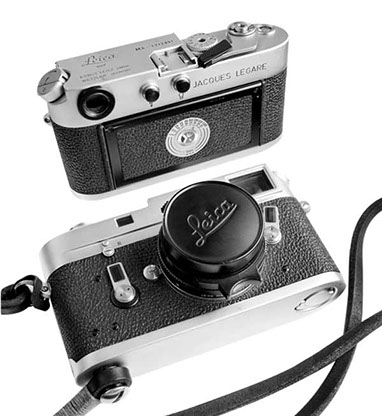 The discovery of Jacques Legare's work was precipitated by my purchase of this camera (shown front and rear, with Legare's name engraved on the back) at an auction in Paterson, New Jersey. It's a Leica M4, with a 35mm lens. This kind of camera was popular with photojournalists in the time period Legare was active. The camera was in fair condition, since it had spent about 20 years in a trunk in less than ideal conditions, but some minimal servicing was all that was required to put it into working form again. Three books of negatives were found hidden under a wooden divider in the bottom of the trunk.